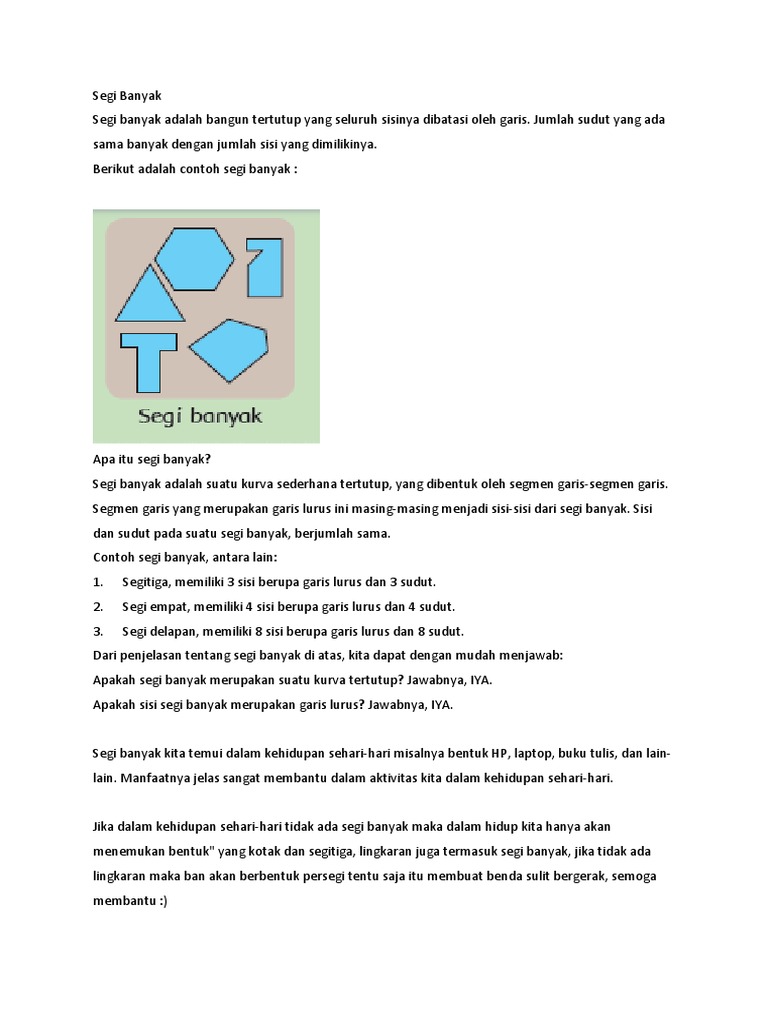 Gambarlah 2 Contoh Bukan Segi Banyak. Dapatkan penjelasan bukan hanya jawaban. Segi banyak adalah sebuah bangun tertutup yang seluruh sisinya dibatasi oleh garis.